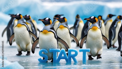 Fototapeta premium A group of king penguins walking on icy terrain with a blue ice backdrop and the word 'START' in bold letters prominently displayed