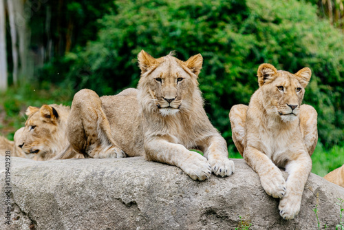 © wedmoments.stock, Fototapeta premium A group of lions resting in the wild. The concept of animal and wildlife protection.