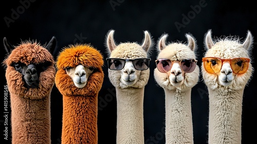 © Olga, Fototapeta premium A group of llamas in sunglasses, adorned with fake llama headdresses