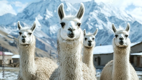 Obraz premium A group of llamas stands in front of majestic mountains, showcasing their...