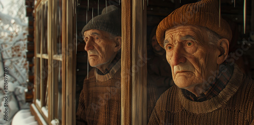 Naklejka premium A group of lonely old men stood at a window looking out into the open air