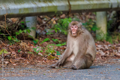 Naklejka premium 夕暮れの林道に現れた、可愛いニホンザル(オナガザル科)の群れ。日本国神奈川県相模原市、早戸川林道にて。 2024年4月撮影。A group of lovely Japanese macaque, Snow Monkey (Macaca fuscata) appeared on a forest road at dusk.At Hayatogawa forest road, Sagami