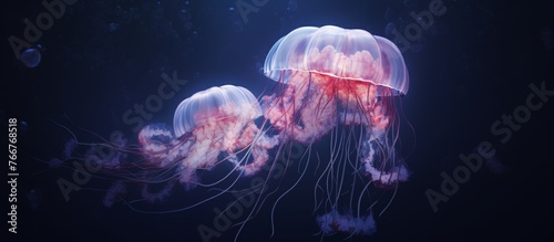 Naklejka premium A group of marine invertebrates known as jellyfish, with their bioluminescent bodies emitting electric blue and magenta hues, swim gracefully in the dark underwater world