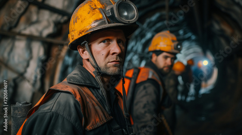 Fototapeta premium A group of miners works deep in a coal mine, undertaking challenging and...
