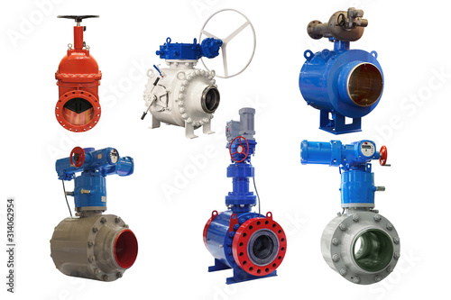 Fototapeta premium a group of modern shut-off valves of various designs for a gas pipeline isolated on white background