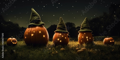 © Natalia, Fototapeta premium A group of mysterious pumpkins sitting on top of a grass-covered field. Generative AI.