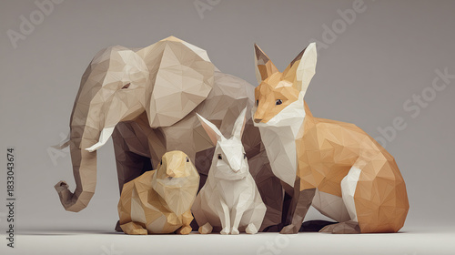 Naklejka premium A group of origami animals including an elephant, a fox, and two rabbits,...