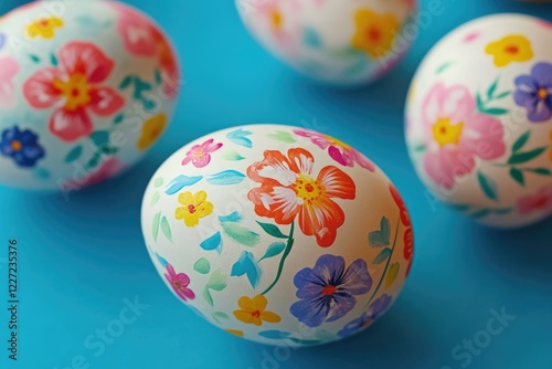 Fototapeta premium A group of painted eggs with flowers on them. The eggs are arranged in a row on a blue background