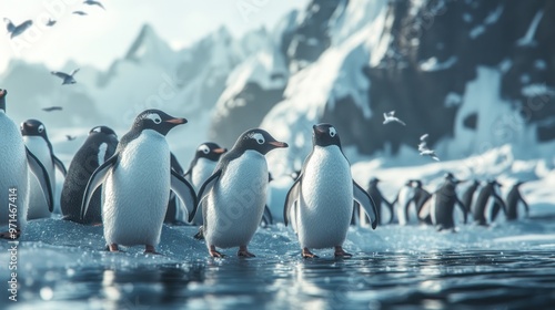 Obraz premium A group of penguins huddles together on an icy shoreline with snow-capped cliffs in the background, with the harsh winter wind adding a sense of survival and togetherness.
