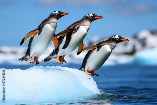 Fototapeta premium A group of penguins leaping from an iceberg, diving into the freezing waters...