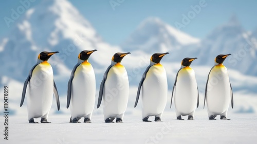 © KayKai, Fototapeta premium A group of penguins standing in a line on a snowy mountain