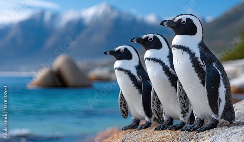 © Kien, Fototapeta premium a group of penguins standing on the rocks