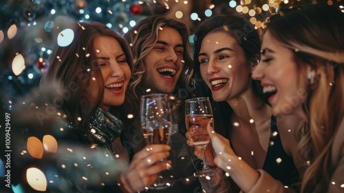 © liliyabatyrova, Obraz premium A group of people are laughing and drinking champagne together