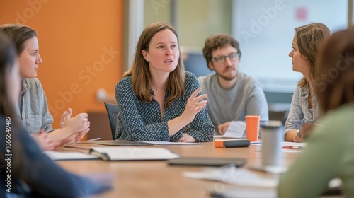 Fototapeta premium A group of people are sitting around a table, one of them is talking