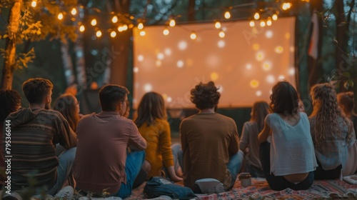Naklejka premium A group of people are sitting on a blanket in a forest