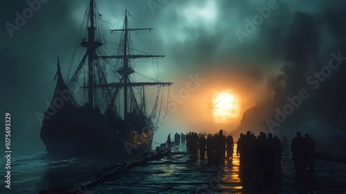 © Linus, Obraz premium A group of people are walking on a pier next to a large ship