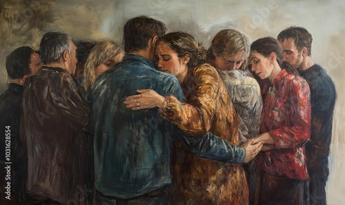 © jambulart, Naklejka premium A group of people hugging in a painting.