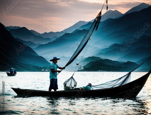 © Miklos, Naklejka premium A group of people in a boat on a body of water with mountains in the background.