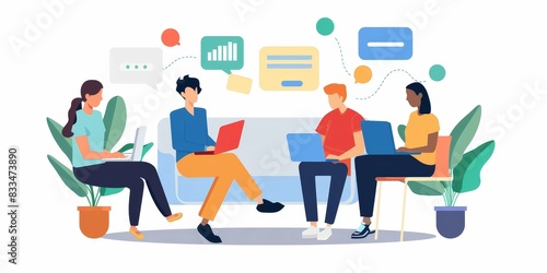 © Kamonwan, Obraz premium A group of people sitting on chairs and working on their laptops.