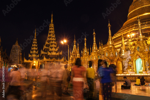 © kingmauri, Fototapeta premium a group of people standing in front of a lit up building at night