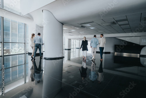 Obraz premium A group of people walks through a spacious, contemporary office lobby,...