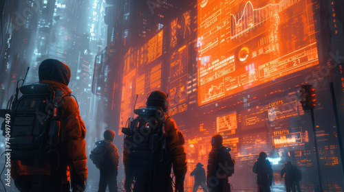 © Justlight, Fototapeta premium A group of people wearing futuristic suits stand in front of a holographic screen displaying realtime graphs and statistics of various digital currencies. In the background