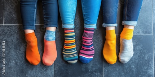 Fototapeta premium A group of people wearing multi-colored mismatched socks. Odd socks day,...