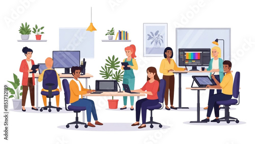© Stock Image Zone, Fototapeta premium A group of people working together in a modern office space with computers and plants.