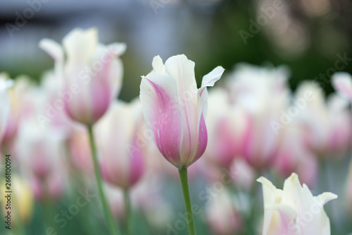 © donikz, Naklejka premium A group of pink tulips in the park. Spring landscape