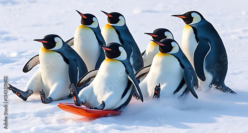 © Nichapa888, Fototapeta premium A group of playful penguins sliding on ice, with a large, clear area of snow