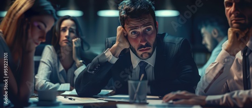 © JK_kyoto, Obraz premium A group of professionals in a tense meeting, showcasing expressions of concern and deep contemplation in a dimly lit environment.