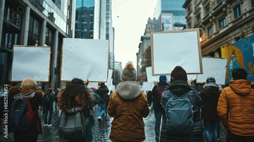 © G.Go, Fototapeta premium A group of protesters hold signs and backpacks while standing on a city street
