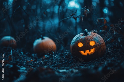 © Vii, Naklejka premium A group of pumpkins sitting on the edge of a forest, perfect for autumn or harvest-themed designs