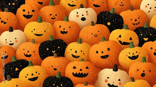 © Olga, Obraz premium A group of pumpkins with face paintings, resembling Jack-o'-lanterns