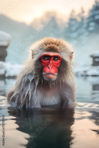 Fototapeta premium a group of red-cheeked monkeys bathing in a natural onsen hot spring in Snow....