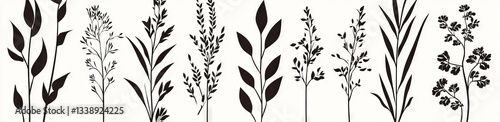 © Julia, Naklejka premium A group of reed shoots, reeds, and coastal flora. Ferns next to decomposing stumps. A swamp landscape featuring a riverbank. Rendered in silhouette. Isolated on a white background. Modern aesthetic