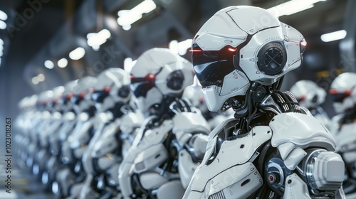 © liliyabatyrova, Fototapeta premium A group of robots are lined up in a factory