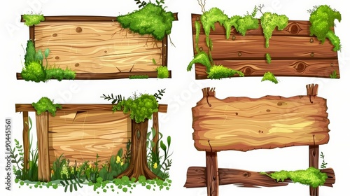 Naklejka premium A group of rustic-themed signboards covered in moss and green foliage. These wooden boards provide an aged yet lively look, suitable for outdoor or nature-themed decor.
