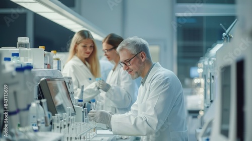 Fototapeta premium A group of scientists are working in a lab, with one of them wearing a lab coat