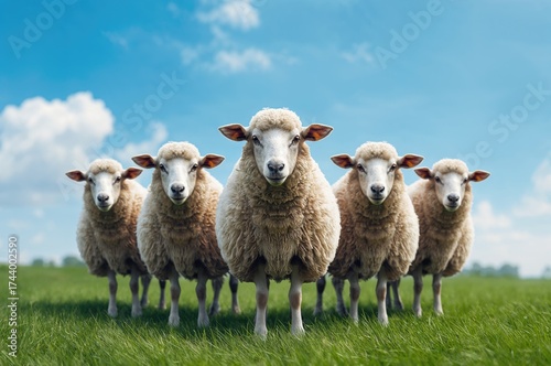 © vxnaghiyev, Fototapeta premium A group of sheep standing in a field, all looking directly at the lens.