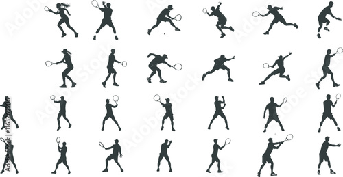 © Adi, Naklejka premium A group of silhouettes of tennis players hitting the ball and posing. using rackets and sport style. suitable for tennis sport posters, banners and flyers