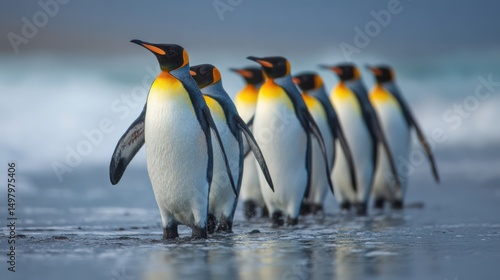 Obraz premium A group of six penguins walks gracefully along the wet sand by the ocean. The early morning light casts a gentle glow, highlighting their vibrant colors and features