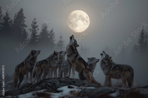 © Milos, Naklejka premium A group of six wolves gathered on a rock, all howling together at the bright, full moon in a nighttime forest setting, with mist creating an eerie and enchanting atmosphere.