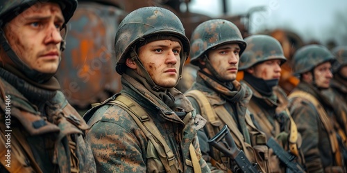 © Molang Visual, Fototapeta premium A group of soldiers in uniform standing in a row looking to the left