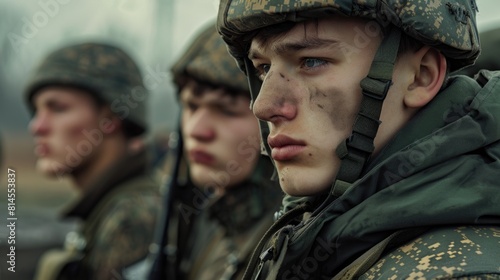 © Ева Поликарпова, Fototapeta premium A group of soldiers standing together. Suitable for military and teamwork concepts