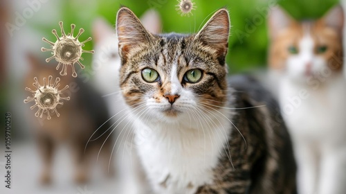 © Nattanon, Obraz premium A group of stray cats, with one visibly sick, standing in an environment surrounded by highlighted bacteria