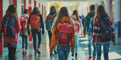 Fototapeta premium A group of students walking down a hallway with backpacks