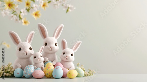© Pointofview, Obraz premium A group of stuffed rabbits are sitting on a table with a bunch of Easter eggs