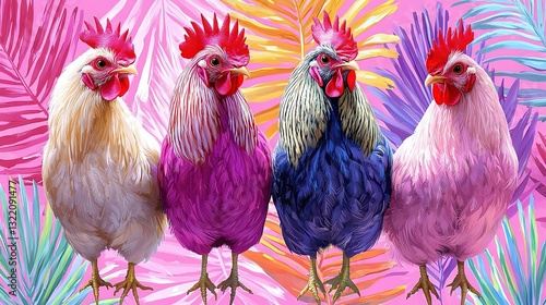 © Sonya, Fototapeta premium A group of three chickens stand together on a palm-leaf covered ground in front of a pink backdrop