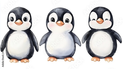 © Sonya, Naklejka premium A group of three penguins sitting together on a white surface against a white background